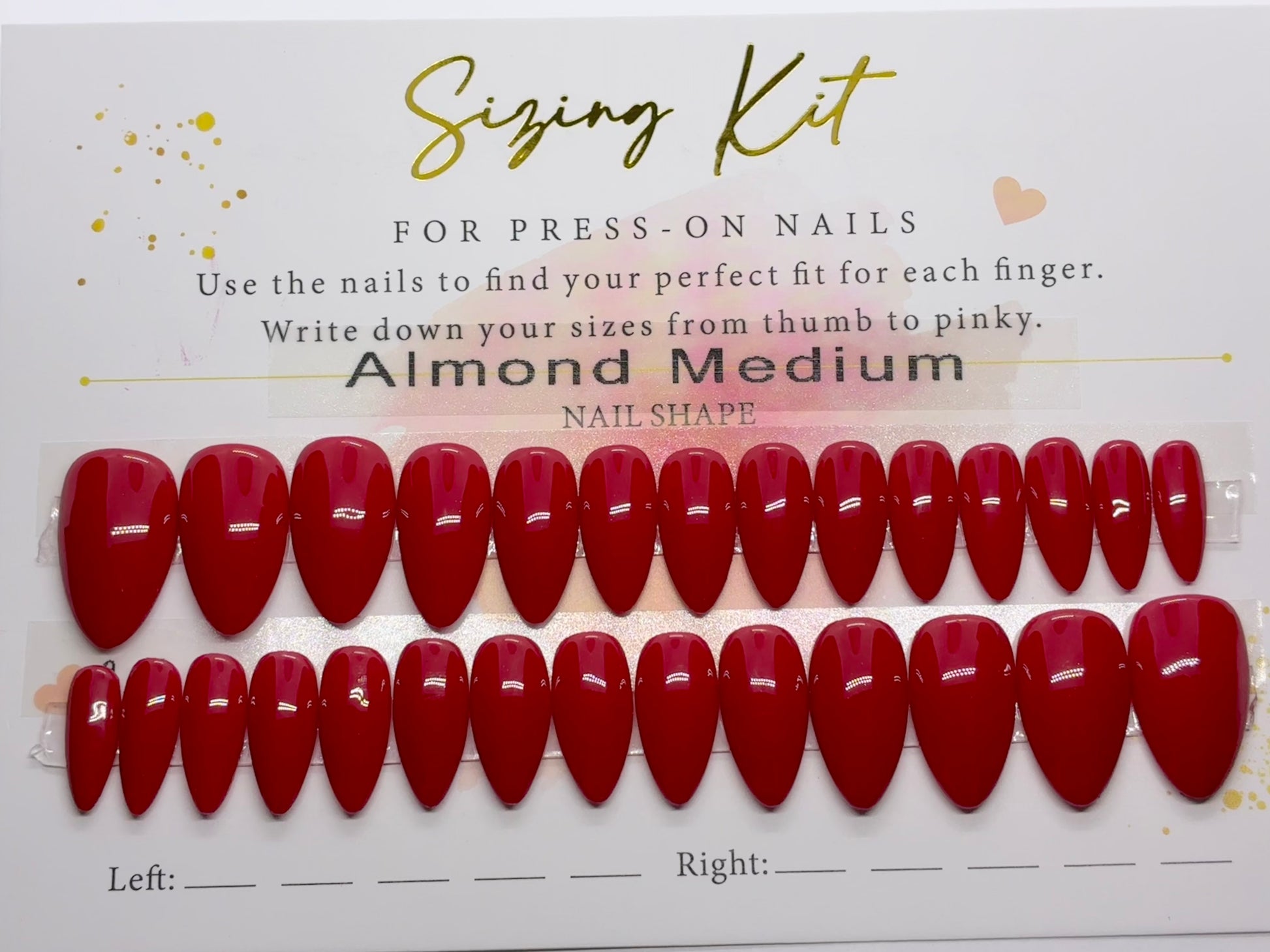 A Ready To Wear Sizing Kit is great if you don’t know your sizes yet but want a set of polished press-on nails to wear right away. The tips come fully polished (solid color, glossy or matte finish) so you can wear them immediately after sizing your nails. Includes 2 tips in each size for shape/length selected. Includes nail prep kit, nail glue, and nail tabs. PRICE OF THIS KIT DOES NOT GET CREDITED TOWARDS CUSTOM SET.